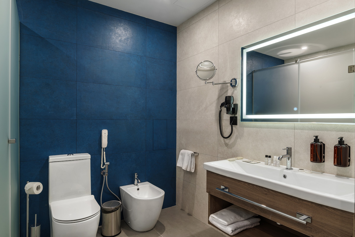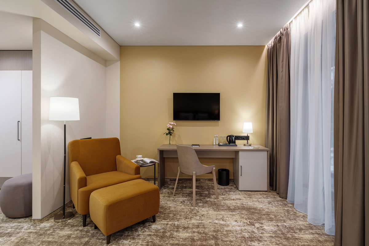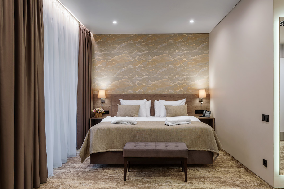 Элегантный номер категории «Делюкс» отличается продуманным интерьером и ощущением простора. Расположенный в первом корпусе, он рассчитан на размещение до двух человек и имеет площадь от 35 м². Из номера открывается выход на балкон, где можно насладиться свежим воздухом и спокойной атмосферой курорта. Ванная комната оснащена тропическим и гигиеническим душем, предусмотрены банные принадлежности и средства личной гигиены. Для удобства гостей установлены телевизор, сейф, фен, холодильник и чайная станция. Просторная кровать King size (200×200 см) с ортопедическим матрасом обеспечивает максимальный комфорт и способствует полноценному восстановлению.